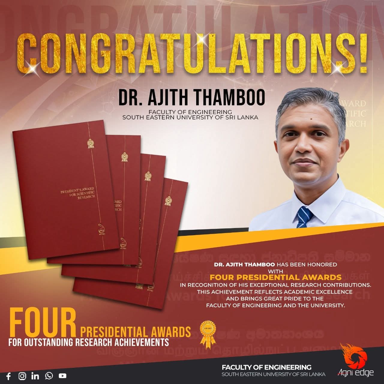 South Eastern University of Sri Lanka (SEUSL) is pleased to extend its heartfelt congratulations to Dr. Ajith Thamboo of the Department of Civil Engineering , Faculty of Engineering , on his distinguished achievement of receiving four Presidential Awards for Outstanding Research Excellence for the year 2021 . The awards were conferred at the Presidential Awards Ceremony for Research Excellence, held at Waters Edge, Colombo, on 18 December 2025.