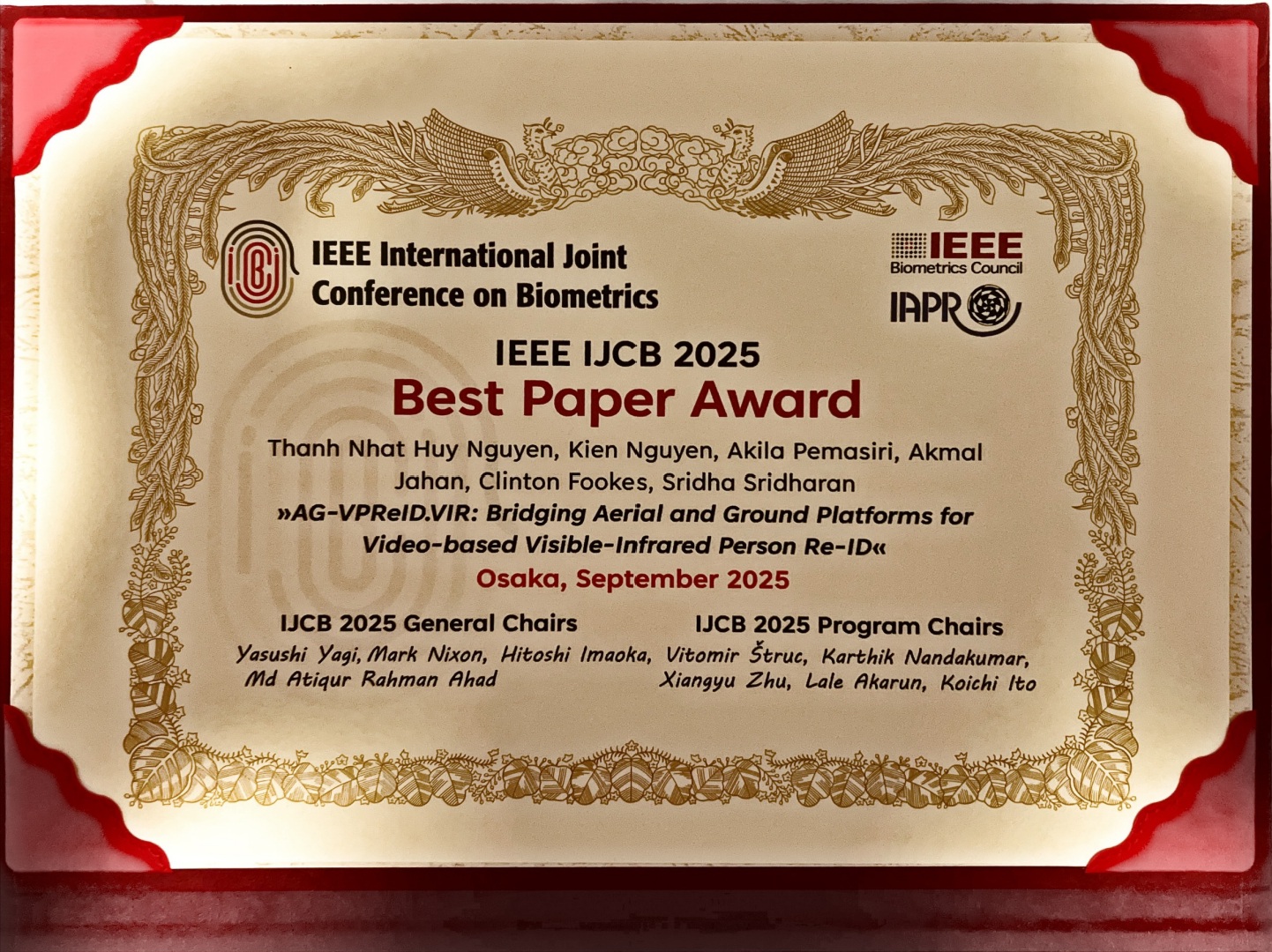 The award-winning paper, “AG-VPReID-VIR: Bridging Aerial and Ground Platforms for Video-based Visible–Infrared Person Re-Identification,” presents a novel approach to person re-identification by integrating aerial and ground platforms across visible and infrared modalities. The research was conducted in collaboration with the Queensland University of Technology (QUT) AI Research team and represents a significant contribution to advancing biometric and computer vision research with AI technologies.