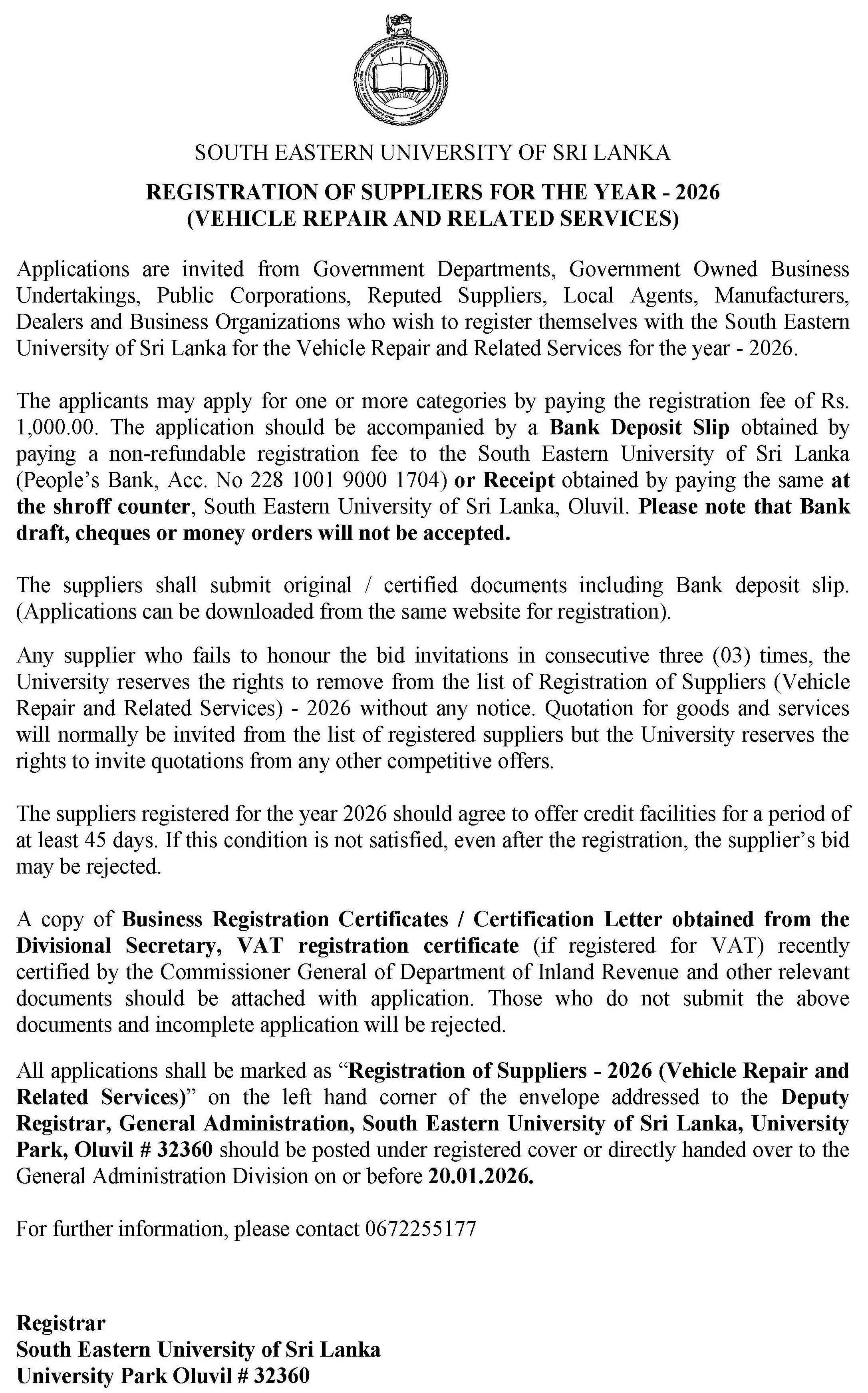 22 Dec Application for Registration of Suppliers – 2026 (Vehicle repair and related services) Web Admin 2025-Dec-22 G.Admin Advertisement Application Form