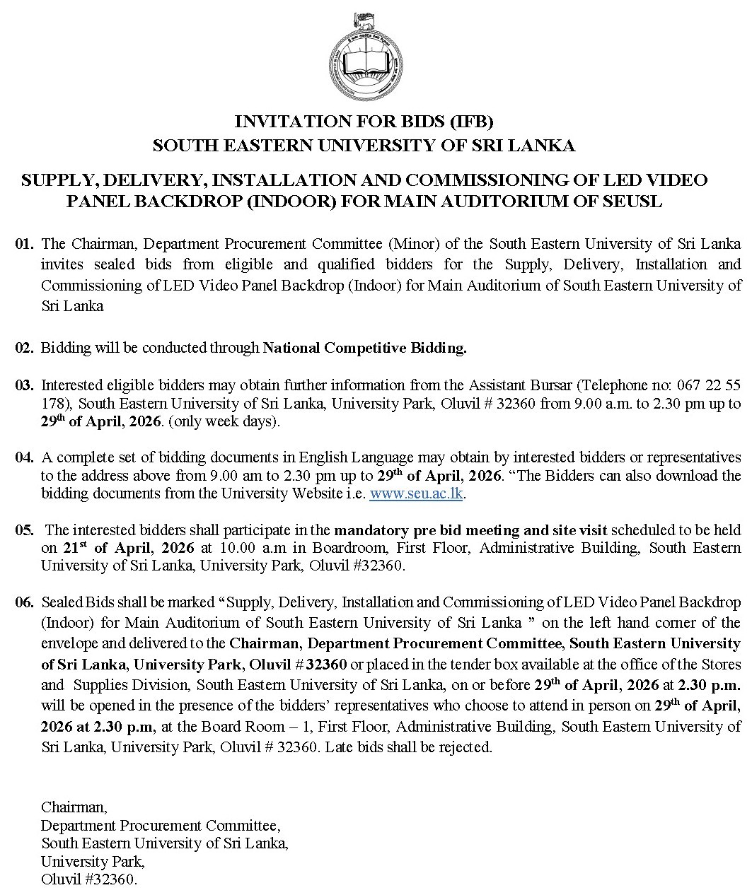 10 Apr INVITATION FOR BIDS (Procurement of Supply, Delivery, Installation and Commissioning of LED Video Panel Backdrop (Indoor) for Main Auditorium of SEUSL) Web Admin 2026-Apr-10 SSD Advertisement Bid Document