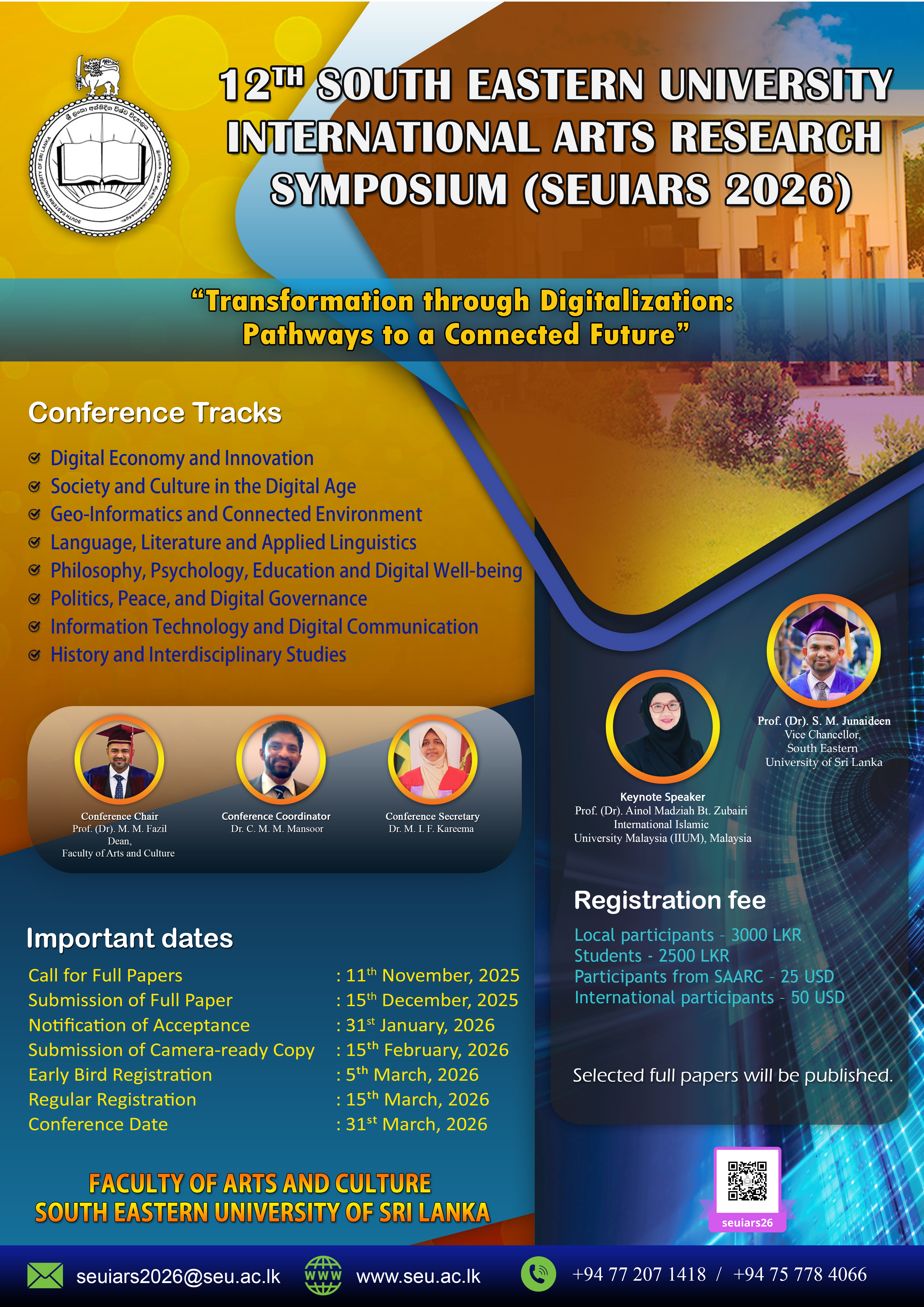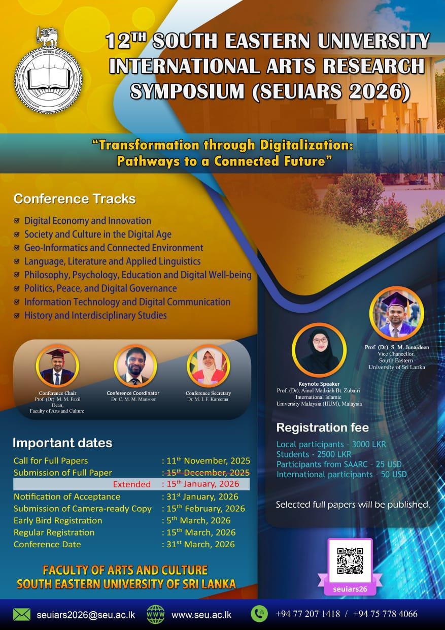 The faculty of Arts and Culture of South Eastern University of Sri Lanka is holding its 12th International Symposium under the theme of “Transformation through Digitalization: Pathways to a Connected Future” on 31st March 2026 in Oluvil, Sri Lanka. This symposium is a unique opportunity for researchers to present their research and development activities.