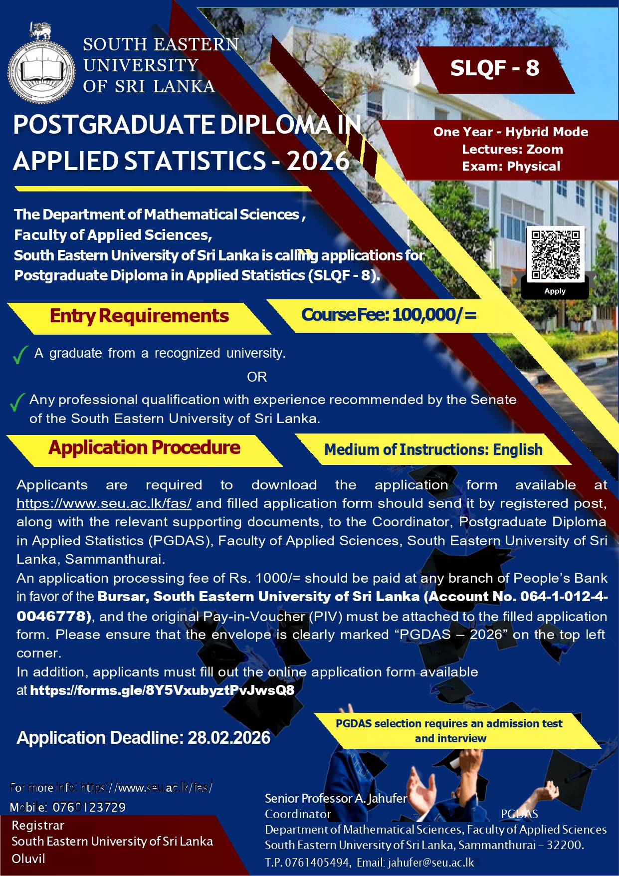 The Postgraduate Unit of FAS, SEUSL is one of the key Functional Units of FAS, which reviews and regulate matters relating to postgraduate study programs. It deals with selection of candidates, admission and progress monitoring of the registered students.