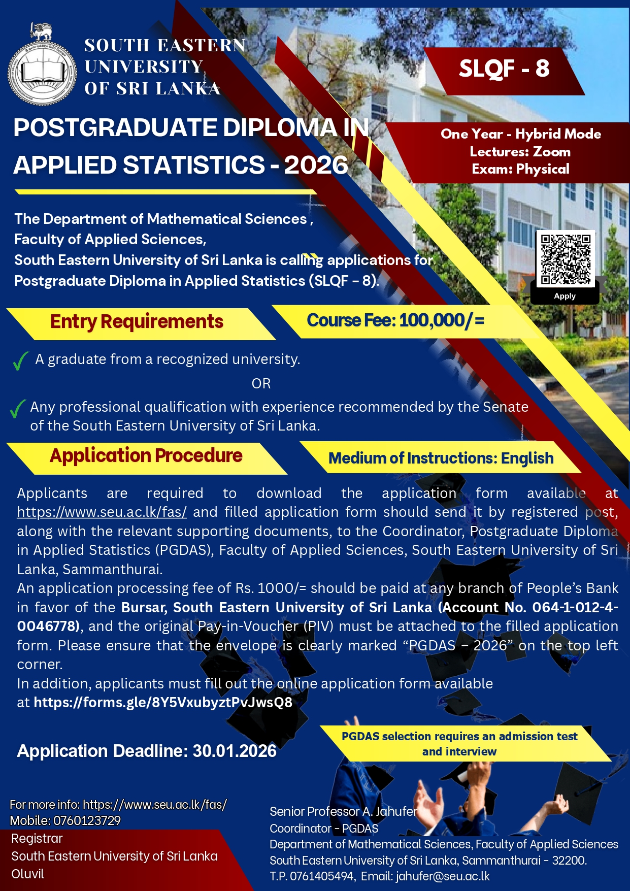 The Postgraduate Unit of FAS, SEUSL is one of the key Functional Units of FAS, which reviews and regulate matters relating to postgraduate study programs. It deals with selection of candidates, admission and progress monitoring of the registered students.