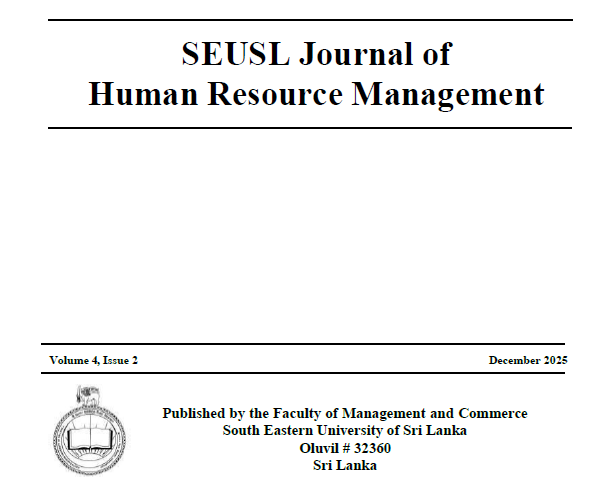 The South Eastern University of Sri Lanka journal of Human Resource Management is an official peer reviewed journal of the Department of Management, faculty of Management and Commerce, South Eastern University of Sri Lanka. SEUSL Journal of Human Resource Management pleased to publish original scholarly papers across the whole spectrum of Human Resource Management. The journal is wide-ranging and diverse and contributions are welcomed across a wide range of research methodologies, evidences from Sri Lanka and across world are equally acceptable. Each paper will be judged according to international standards within its topic area, the originality of its contribution, its relevance to development of the subject and its quality of exposition.