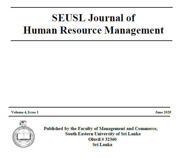 The South Eastern University of Sri Lanka journal of Human Resource Management is an official peer reviewed journal of the Department of Management, faculty of Management and Commerce, South Eastern University of Sri Lanka. SEUSL Journal of Human Resource Management pleased to publish original scholarly papers across the whole spectrum of Human Resource Management. The journal is wide-ranging and diverse and contributions are welcomed across a wide range of research methodologies, evidences from Sri Lanka and across world are equally acceptable. Each paper will be judged according to international standards within its topic area, the originality of its contribution, its relevance to development of the subject and its quality of exposition.