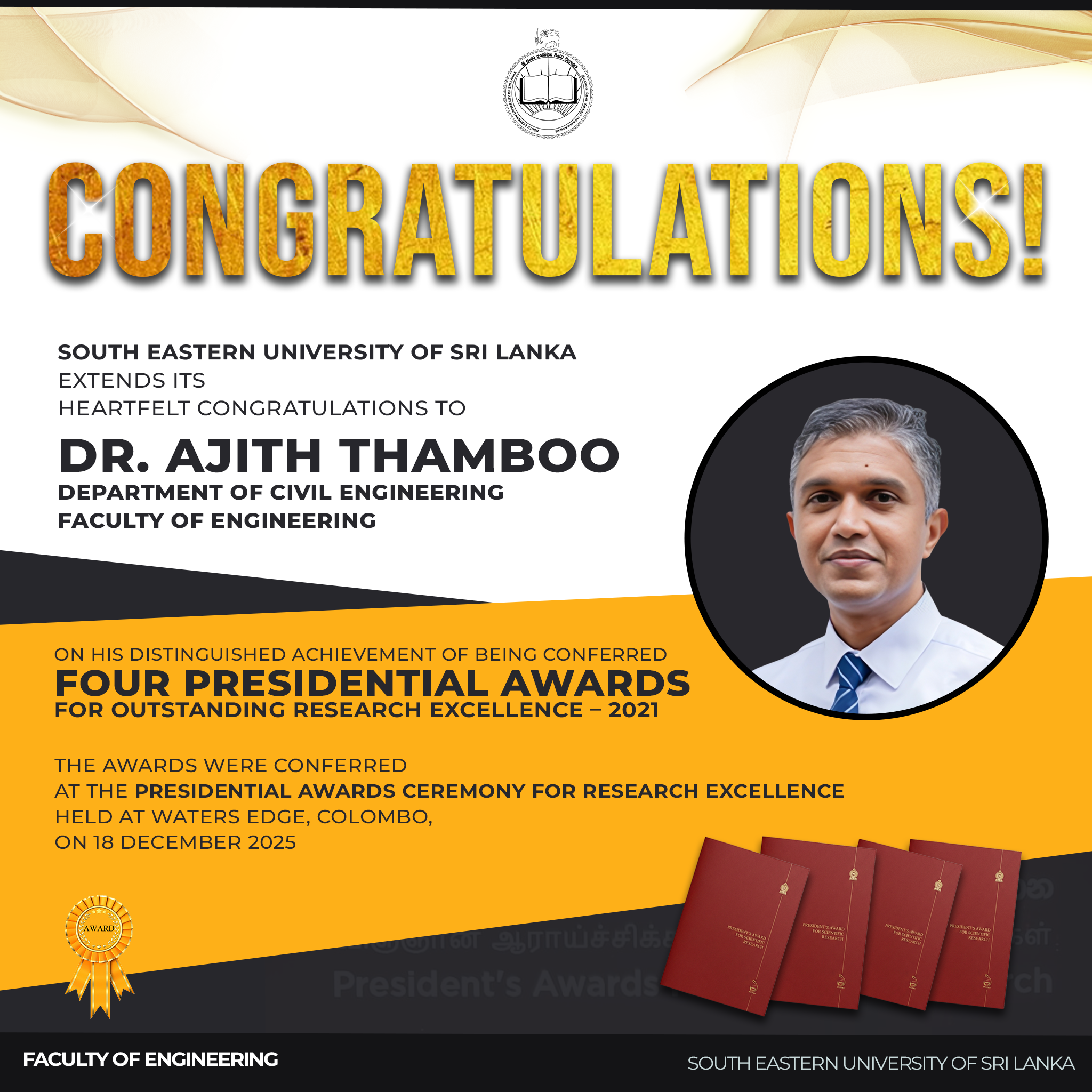 South Eastern University of Sri Lanka (SEUSL) is pleased to extend its heartfelt congratulations to Dr. Ajith Thamboo of the Department of Civil Engineering , Faculty of Engineering , on his distinguished achievement of receiving four Presidential Awards for Outstanding Research Excellence for the year 2021 . The awards were conferred at the Presidential Awards Ceremony for Research Excellence, held at Waters Edge, Colombo, on 18 December 2025.
