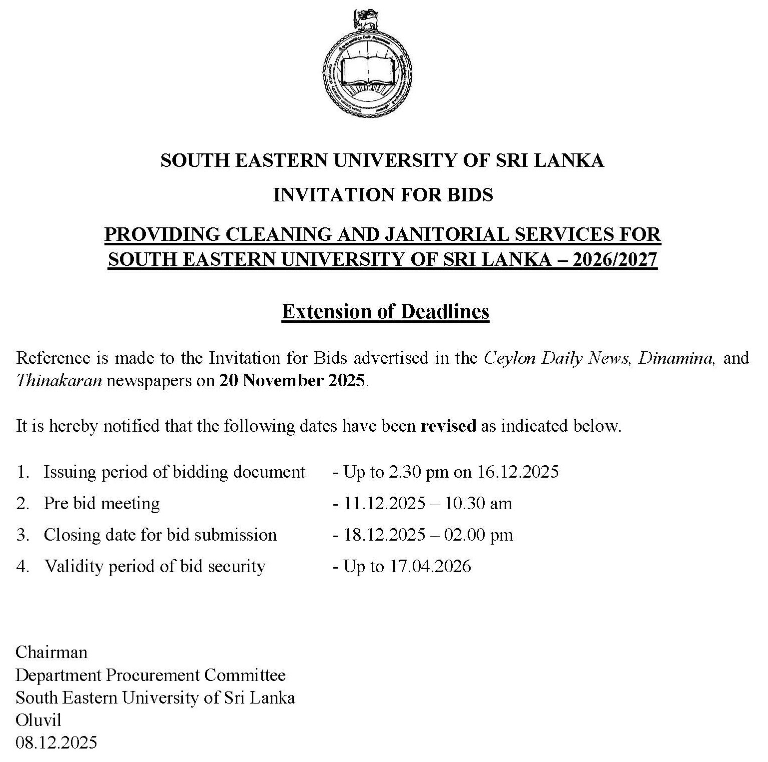 08 Dec INVITATION FOR BIDS [PROVIDING CLEANING AND JANITORIAL SERVICES FOR SEUSL 2026/2027] -Extension of Deadlines Web Admin 2025-Dec-08 G.Admin Advertisement