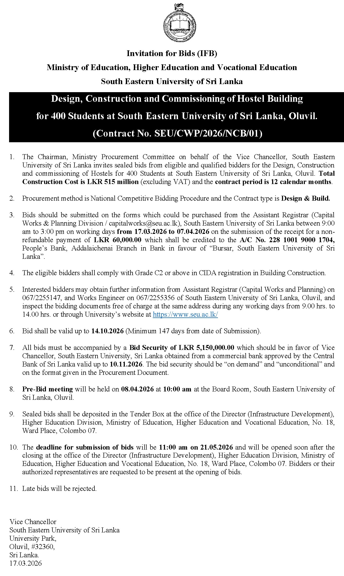 16 Mar INVITATION FOR BIDS (Design, Construction and Commissioning of Hostel Building for 400 Students) Web Admin 2026-Mar-16 G.Admin Advertisement