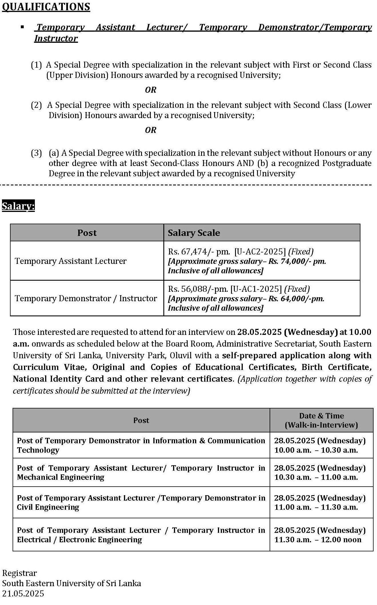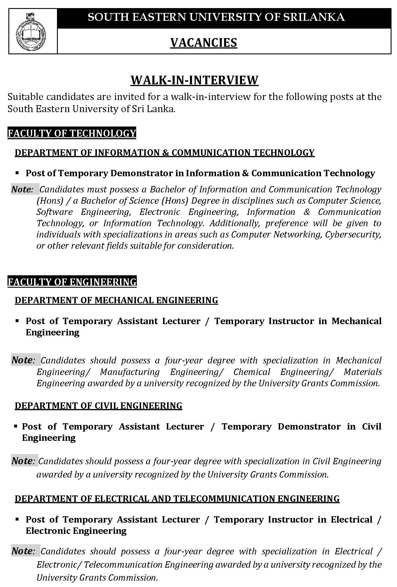 23 May WALK-IN-INTERVIEW (Post of Temporary Assistant Lecturer/ Temporary Instructor/ Demonstrator ) Vacancy Expired Web Admin 2025-May-23 Closing Date : 2025-05-28 Download (Notice)