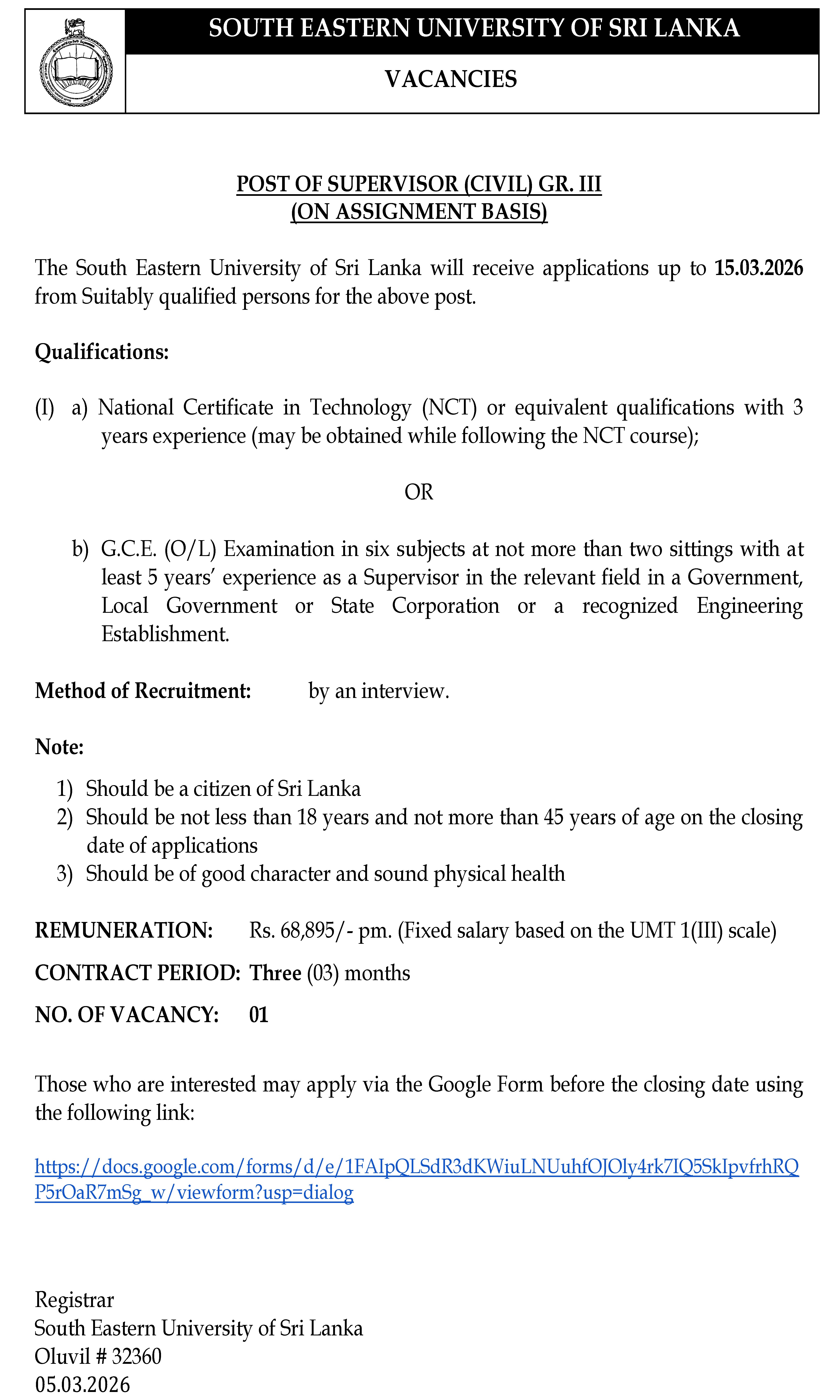 05 Mar POST OF SUPERVISOR (CIVIL) GR. III(ON ASSIGNMENT BASIS) Web Admin 2026-Mar-05 Closing Date : 2026-03-15 Download (Advertisement) Application (Online)