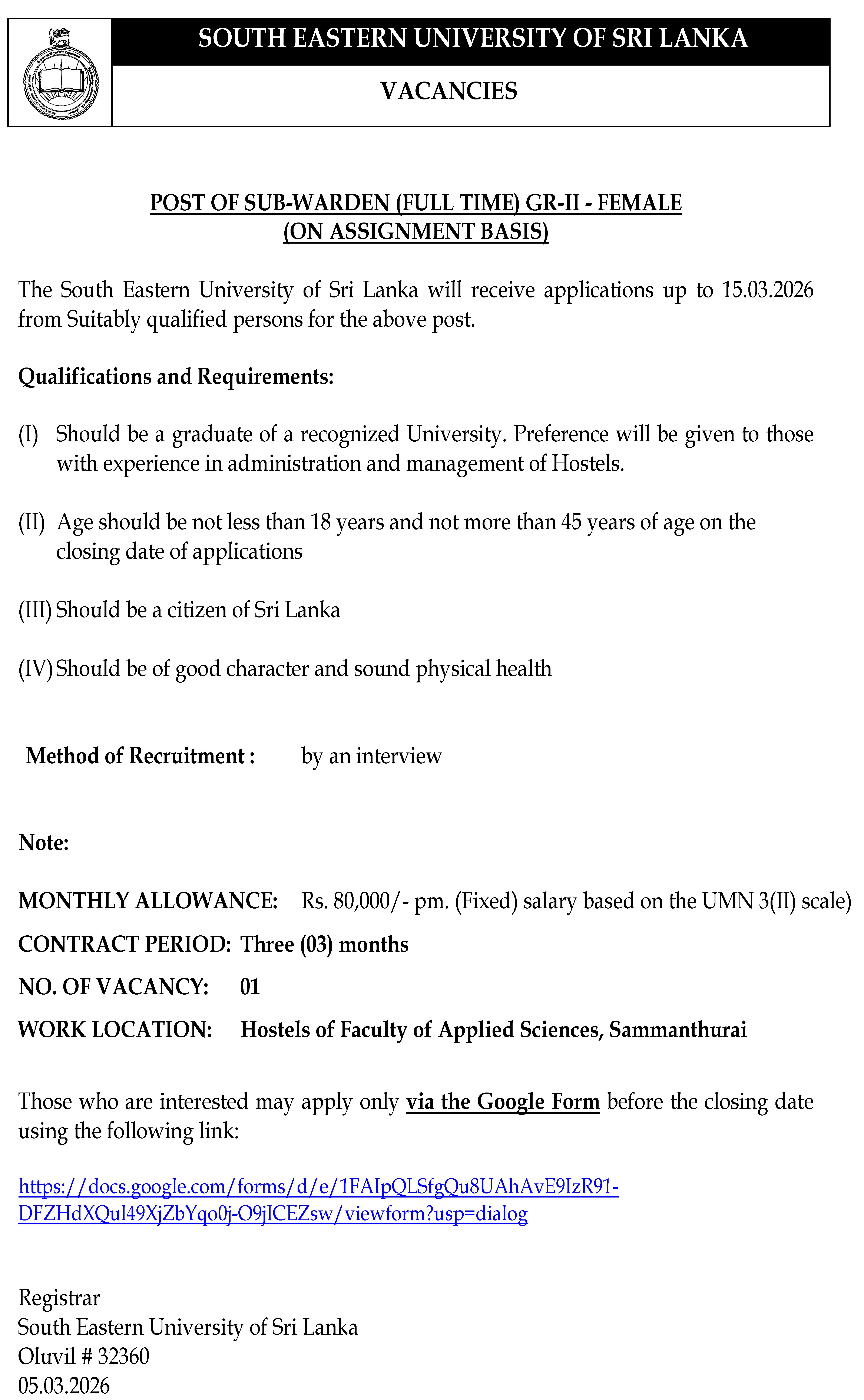 05 Mar POST OF SUB-WARDEN (FULL TIME) GR-II - FEMALE (ON ASSIGNMENT BASIS) Web Admin 2026-Mar-05 Closing Date : 2026-03-15 Download (Advertisement) Application (Online)